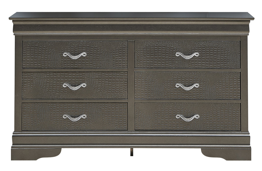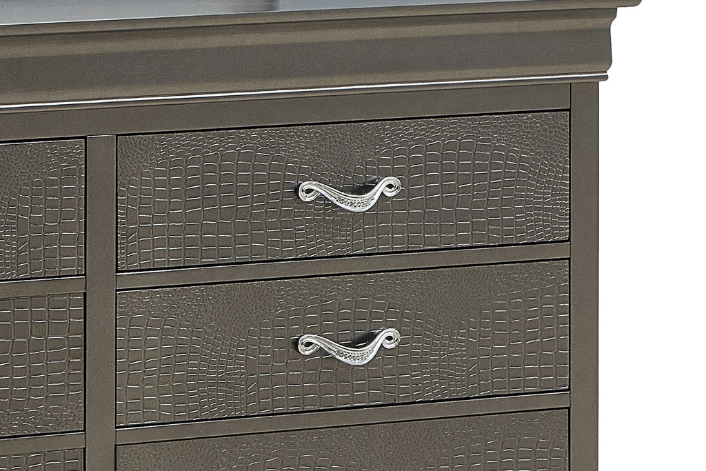 • Silver Champagne "Croc " Finish Highlights this Bedrrom Group. Beds are available in Twin ,Full, Queen and King. Wood veneers and Deep Finishes add Value and Style. Fully Asssembled Case pieces !