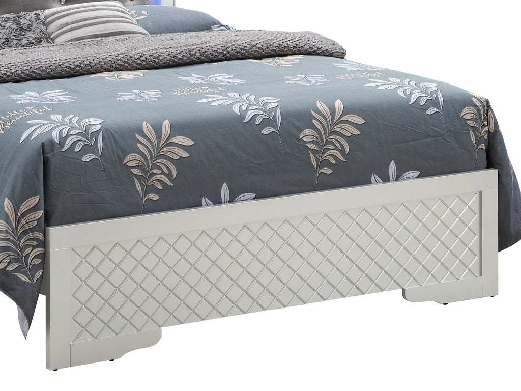 This bed blends modern flair with elegant detailing, creating a standout piece that elevates any bedroom. The diamond-tufted upholstered headboard adds a touch of sophistication, enhanced by soft built-in LED lighting that provides a gentle ambient glow. Mirrored accents frame the headboard for an added touch of refinement, while the footboard features a stylish lattice-pattern panel that brings texture and visual interest. Designed with durability and style in mind, this bed offers dependable support and a polished, contemporary look that suits a wide range of interiors.