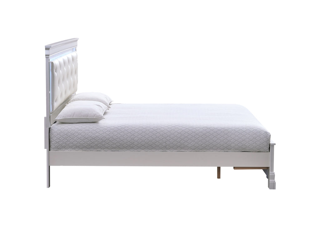 This bed brings together modern elegance and everyday functionality, creating a refined centerpiece for any bedroom. The upholstered, diamond-tufted headboard offers a plush and inviting look, enhanced by soft built-in LED lighting that adds a subtle ambient glow. Mirrored side accents elevate the design with a touch of contemporary sophistication. The footboard includes convenient storage drawers featuring a stylish lattice pattern and sleek hardware, making it easy to keep essentials organized while maintaining a clean, polished aesthetic. Built with a sturdy frame and attention to detail, this bed blends comfort, style, and practicality in one seamless design.