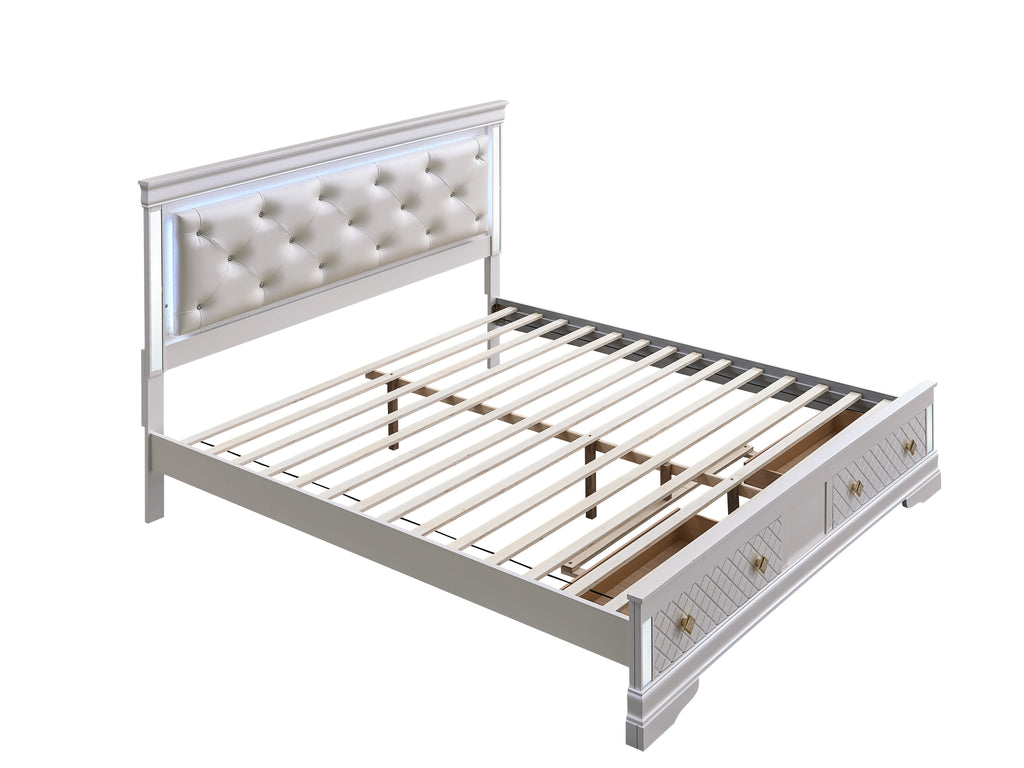 This bed brings together modern elegance and everyday functionality, creating a refined centerpiece for any bedroom. The upholstered, diamond-tufted headboard offers a plush and inviting look, enhanced by soft built-in LED lighting that adds a subtle ambient glow. Mirrored side accents elevate the design with a touch of contemporary sophistication. The footboard includes convenient storage drawers featuring a stylish lattice pattern and sleek hardware, making it easy to keep essentials organized while maintaining a clean, polished aesthetic. Built with a sturdy frame and attention to detail, this bed blends comfort, style, and practicality in one seamless design.