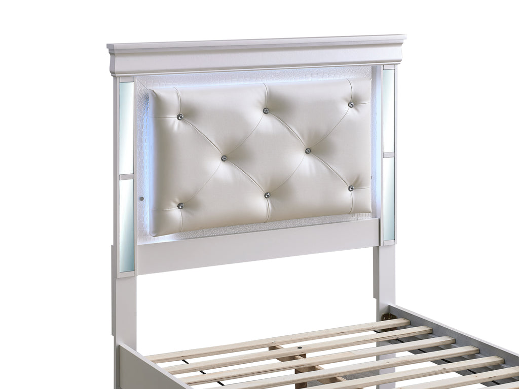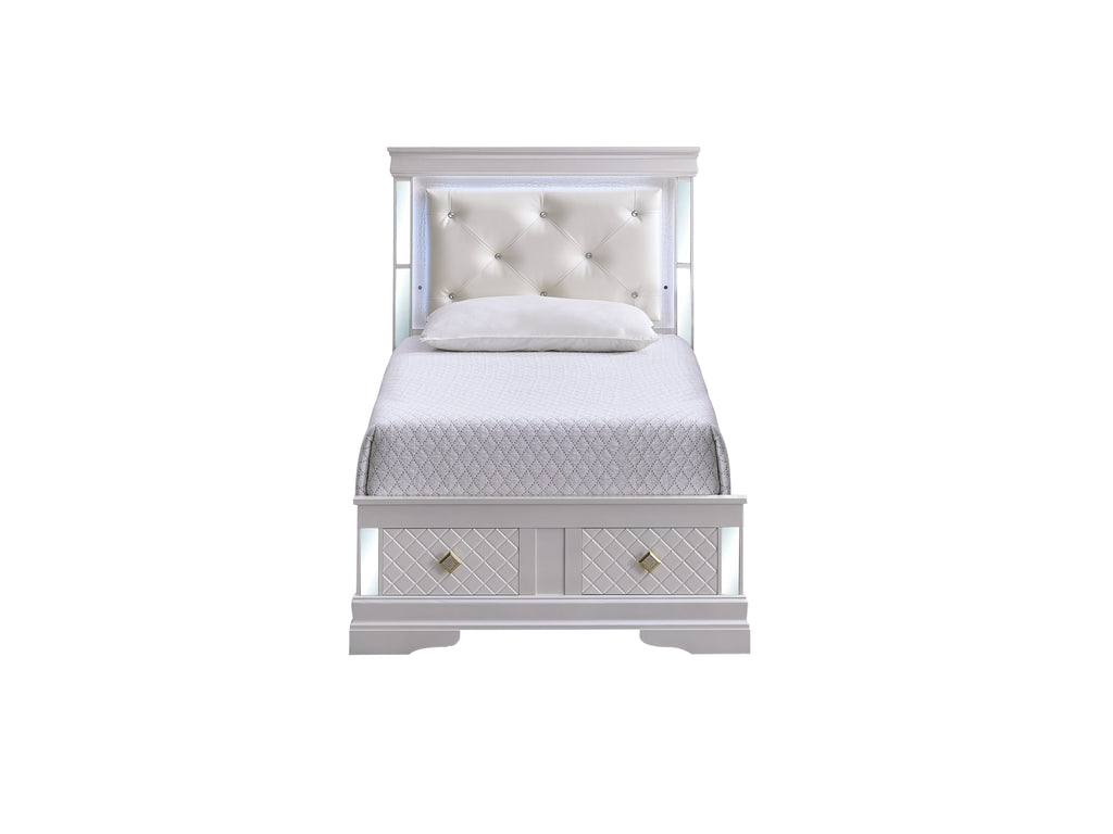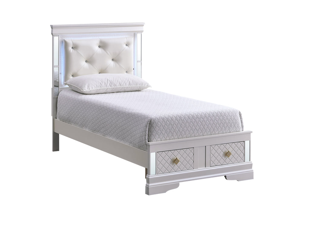 This bed brings together modern elegance and everyday functionality, creating a refined centerpiece for any bedroom. The upholstered, diamond-tufted headboard offers a plush and inviting look, enhanced by soft built-in LED lighting that adds a subtle ambient glow. Mirrored side accents elevate the design with a touch of contemporary sophistication. The footboard includes convenient storage drawers featuring a stylish lattice pattern and sleek hardware, making it easy to keep essentials organized while maintaining a clean, polished aesthetic. Built with a sturdy frame and attention to detail, this bed blends comfort, style, and practicality in one seamless design.