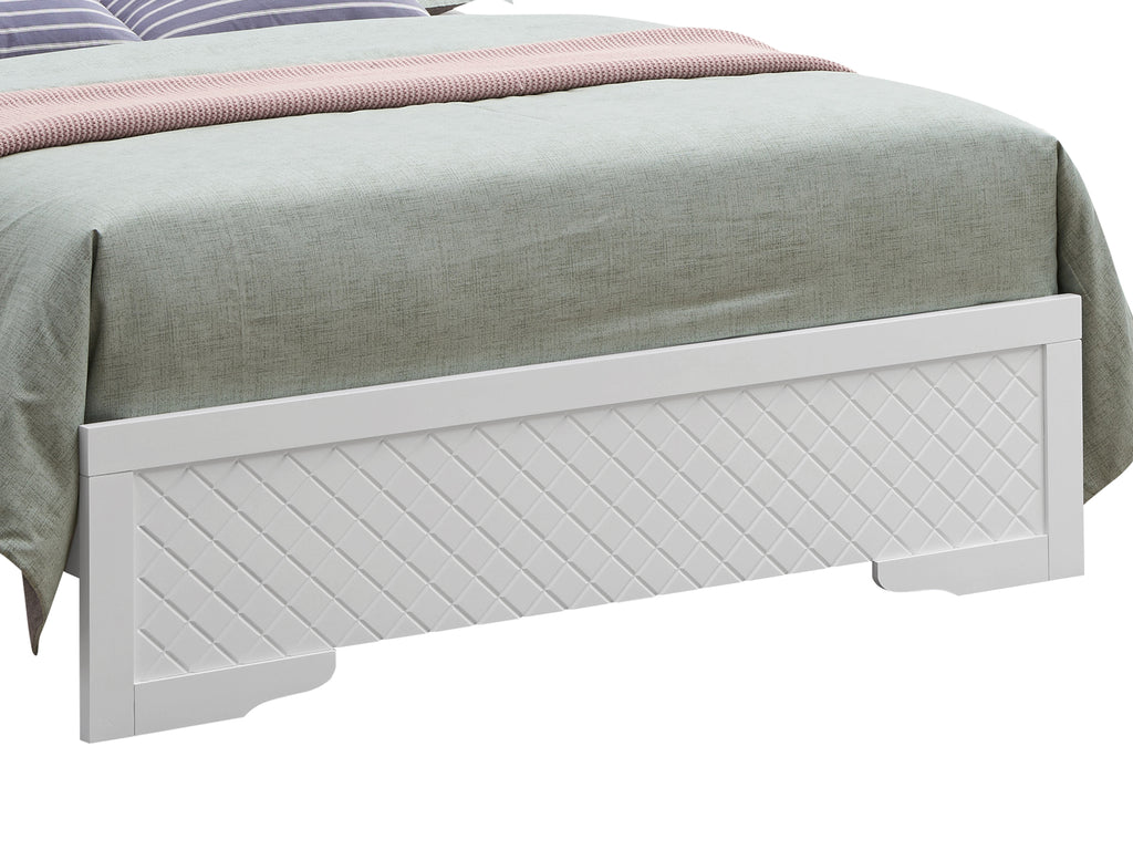 This bed blends contemporary style with subtle luxury, creating a standout centerpiece for any bedroom. The upholstered, diamond-tufted headboard adds a refined and comfortable touch, while built-in LED lighting provides a soft ambient glow that enhances the room’s atmosphere. Mirrored side accents frame the headboard for a sleek, modern finish. The footboard showcases a textured lattice pattern that adds visual interest and a designer feel. Built with a sturdy frame and smooth lines throughout, this bed offers both durability and elevated style, making it an ideal choice for a modern, polished sleeping space.