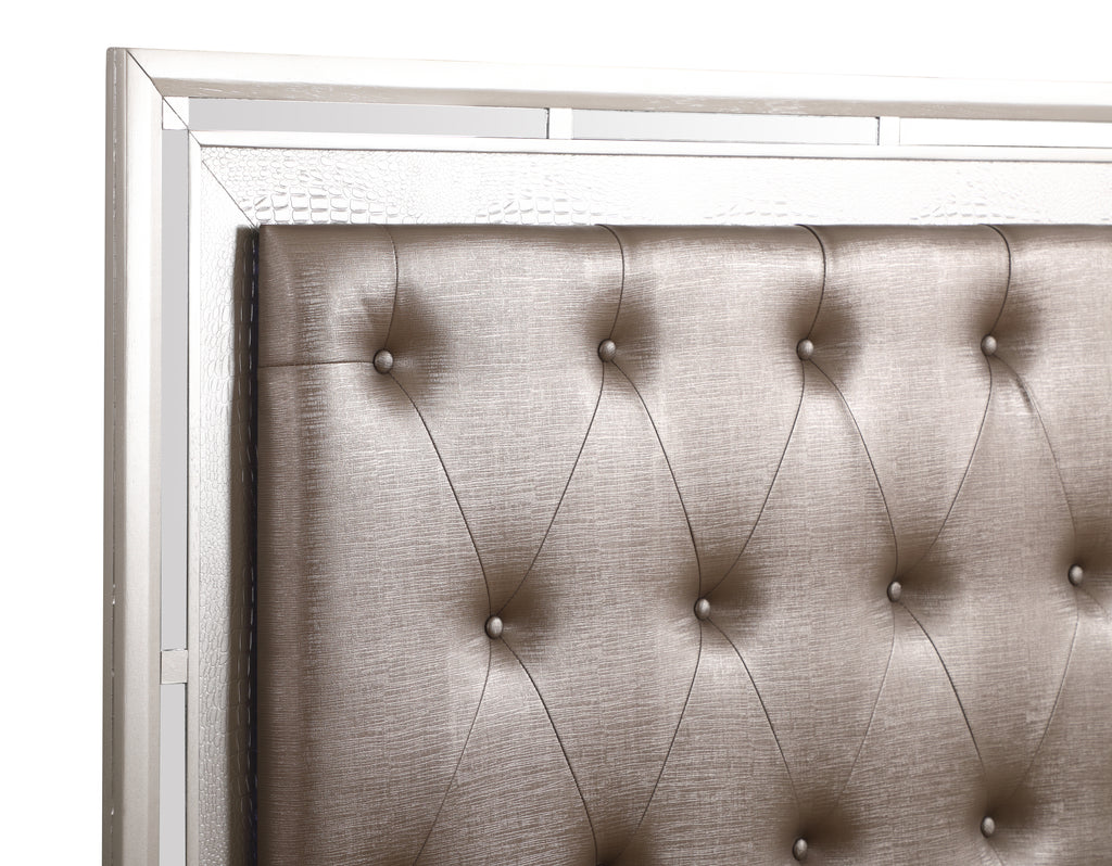 This bed brings together modern glam and refined detailing, creating a statement piece that instantly elevates the bedroom. The upholstered, diamond-tufted headboard offers a plush, inviting feel, while its tall, structured frame adds a sense of presence and sophistication. Mirror-trimmed edges outline both the headboard and footboard, giving the bed a sleek reflective accent that brightens the room and enhances its contemporary look. The footboard features a textured panel design that adds depth and visual interest, tying the whole piece together with a polished, upscale finish. Built with a strong, supportive frame, this bed combines style and stability for a luxurious everyday retreat.