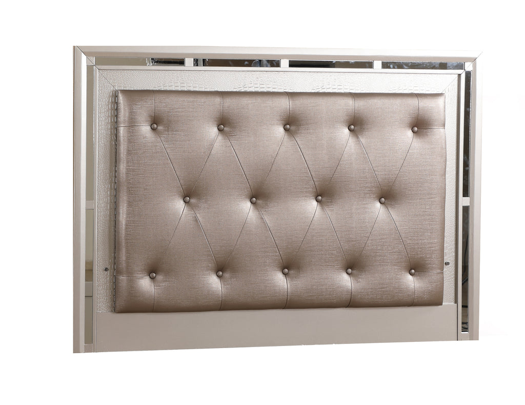 - Mirror-trim accents on the headboard and footboard for a modern touch