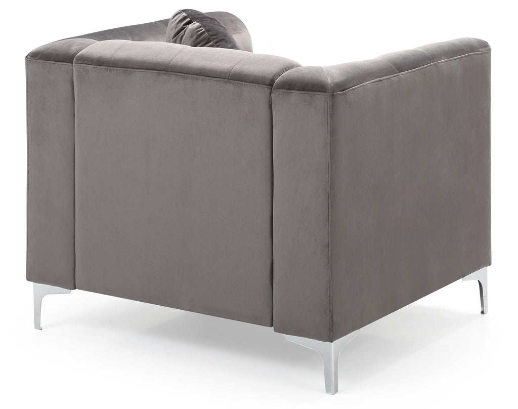 Soft Velvet Button Tufted on the Inside of the Arms and Backs. Pocketed Coil Cushion Seats Make this Set Comfortable and Stylish. Nailhead trimmed and finished off with Chrome Plated Legs , It also includes Round Matching Throw Pillows. KD Design allows for easy Delivery to any Home or Room! Choose from Sofa. Loveseat Chair Or Reversible Chaise Sectional