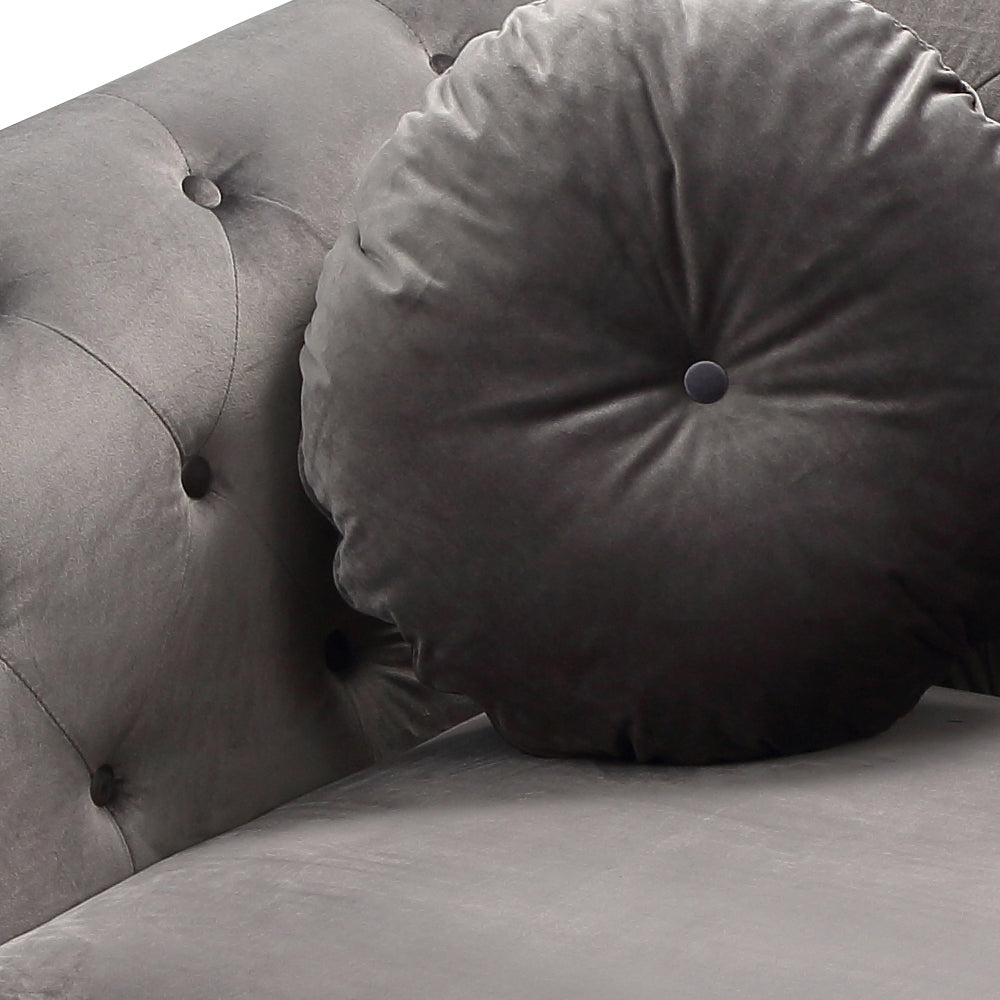 Soft Velvet Button Tufted on the Inside of the Arms and Backs. Pocketed Coil Cushion Seats Make this Set Comfortable and Stylish. Nailhead trimmed and finished off with Chrome Plated Legs , It also includes Round Matching Throw Pillows. KD Design allows for easy Delivery to any Home or Room! Choose from Sofa. Loveseat Chair Or Reversible Chaise Sectional