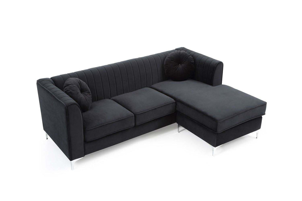 Soft Velvet Channel Tufted on the Inside of the arms and Backs and Pocketed Coil Cushion Seats Make this Set Comfortable and Stylish. Nailhead trimmed and finished off with Chrome Plated Legs , It also includes Round Matching Throw Pillows. KD Design allows for easy Delivery to any Home or Room! Choose from Sofa. Loveseat Chair Or Reversible Chaise Sectional