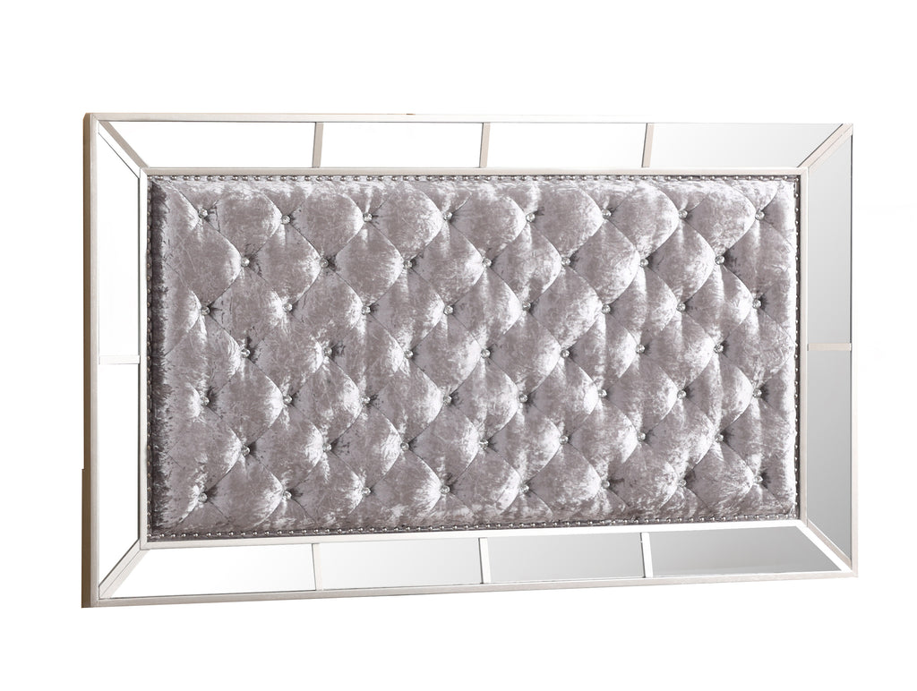 This bed brings an unmistakable sense of luxury with its dramatic profile and finely crafted detailing. The tall, upholstered headboard showcases deep diamond tufting for a plush, inviting look, complemented by shimmering crystal-style accents that add a touch of glamour. Mirrored panel borders frame both the headboard and footboard, catching the light beautifully and giving the bed a bright, upscale presence in any bedroom. The footboard mirrors the same tufted design, creating a cohesive and elegant statement from every angle. Built on a sturdy frame, this bed combines bold design with lasting comfort, making it a standout centerpiece for sophisticated interiors.