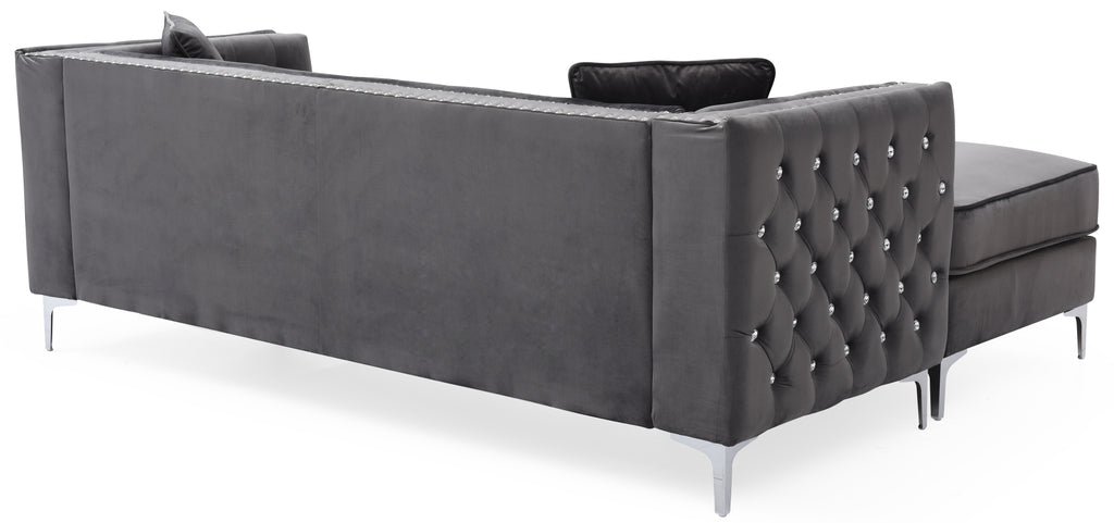 Faux Jewel Tufting, Chrome Legs and Soft Velvety Cover add up to a Super Comfy Set with tons of Style! Pocketed Coil Seating and Welted Cushions add Durability to this Group. It arrives Semi Assembled so it can be Delivered into any Room or Home. It can be set up Left or Right Facing .
