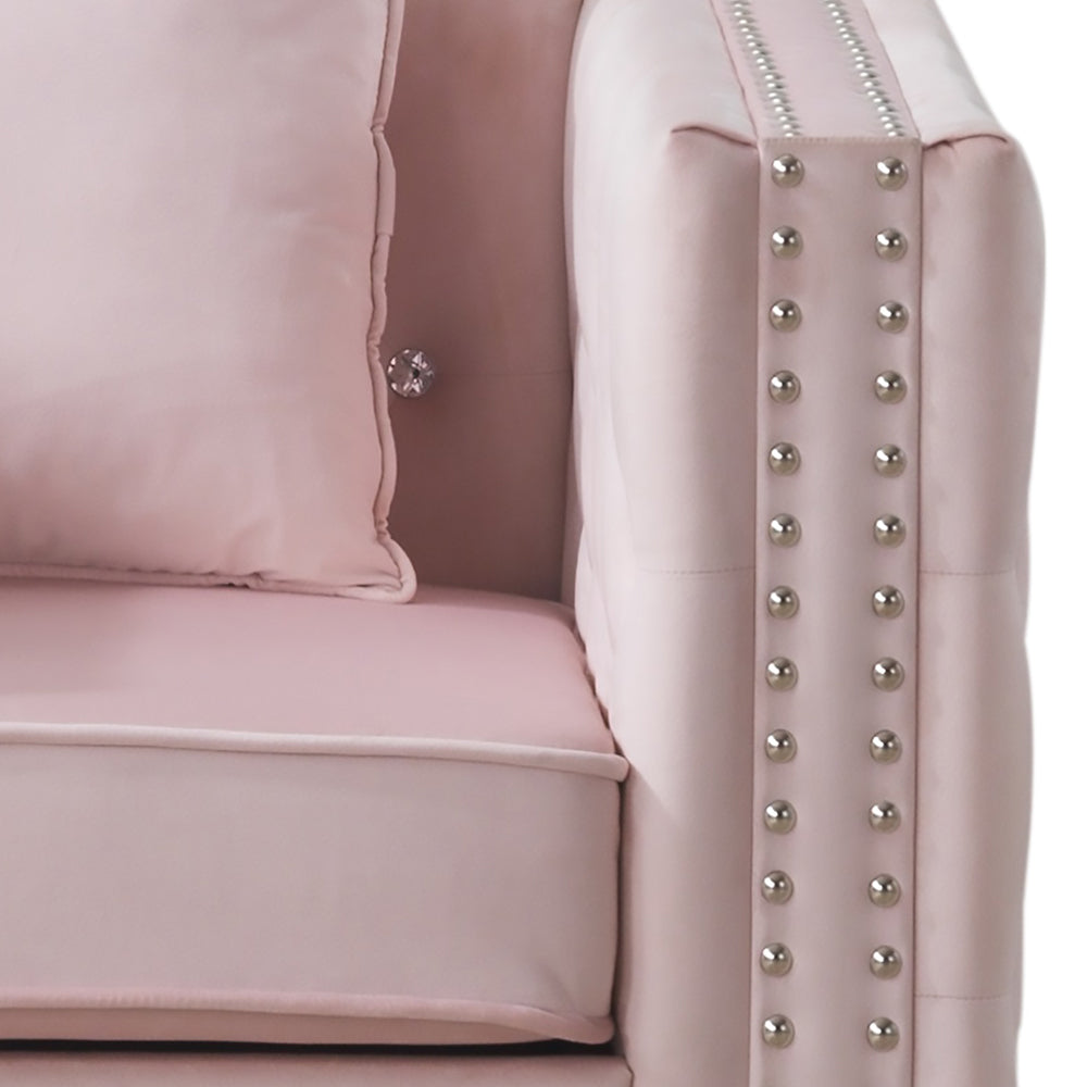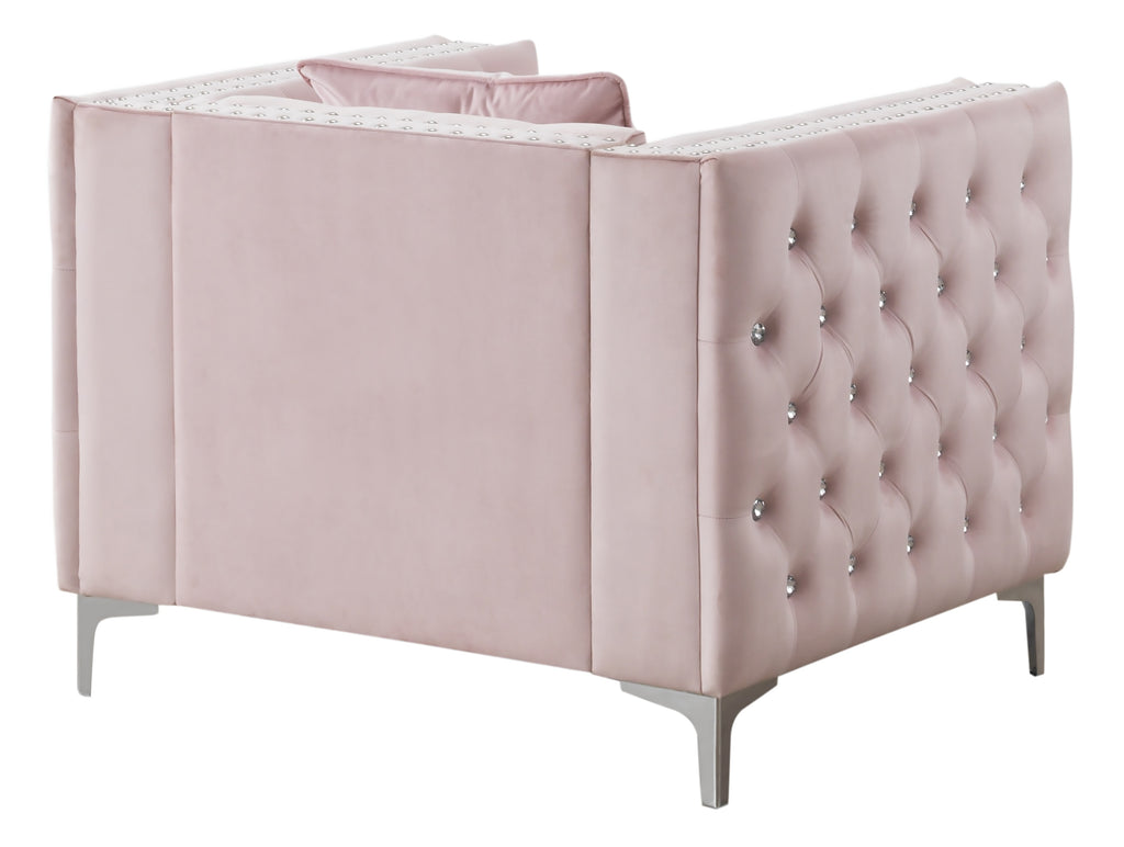 Covered in Soft Velvet Jeweled Buttoned Tufted on the Outside and Inside of the arms and Backs and Pocketed Coil Cushion Seats Make this Set Comfortable and Stylish Nailhead trimmed and finished off with Chrome Plated Legs , It also includes Throw Pillows. KD Design allows for easy Delivery to any Home or Room! Choose from Sofa Loveseat or Chair