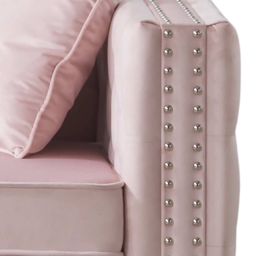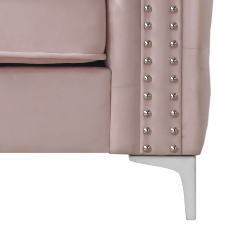 Covered in Soft Velvet Jeweled Buttoned Tufted on the Outside and Inside of the arms and Backs and Pocketed Coil Cushion Seats Make this Set Comfortable and Stylish Nailhead trimmed and finished off with Chrome Plated Legs , It also includes Throw Pillows. KD Design allows for easy Delivery to any Home or Room! Choose from Sofa Loveseat or Chair