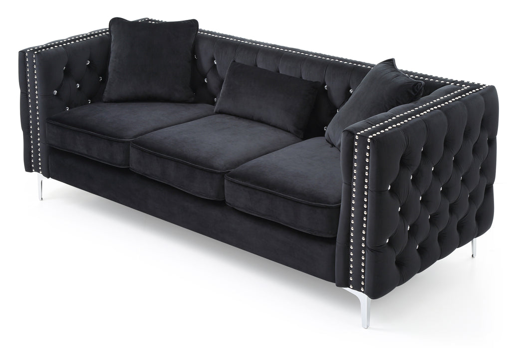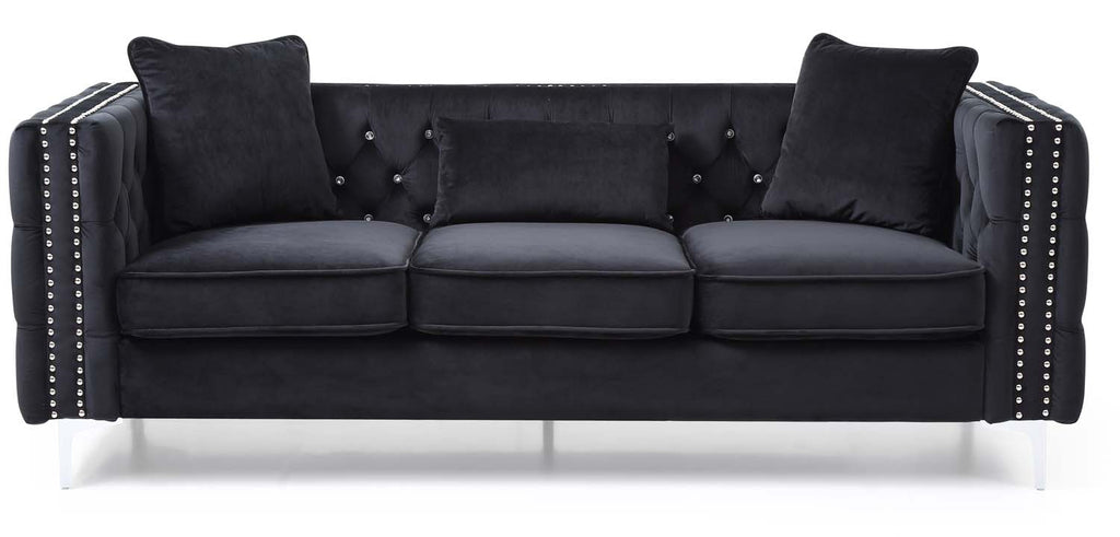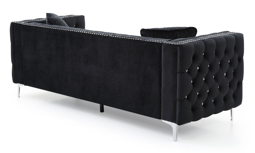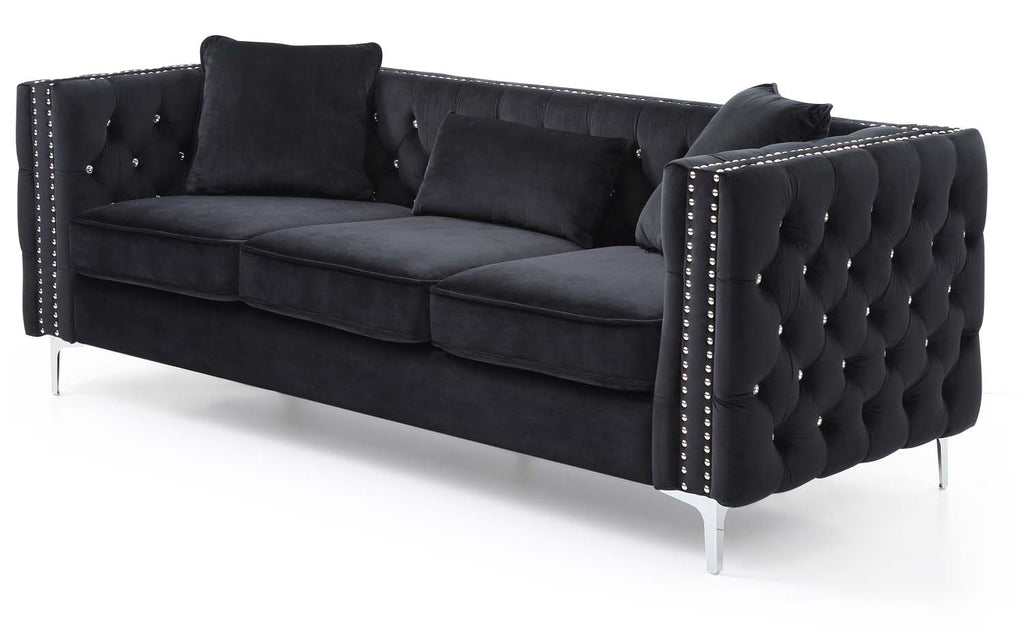 Covered in Soft Velvet Jeweled Buttoned Tufted on the Outside and Inside of the arms and Backs and Pocketed Coil Cushion Seats Make this Set Comfortable and Stylish Nailhead trimmed and finished off with Chrome Plated Legs , It also includes Throw Pillows. KD Design allows for easy Delivery to any Home or Room! Choose from Sofa Loveseat or Chair