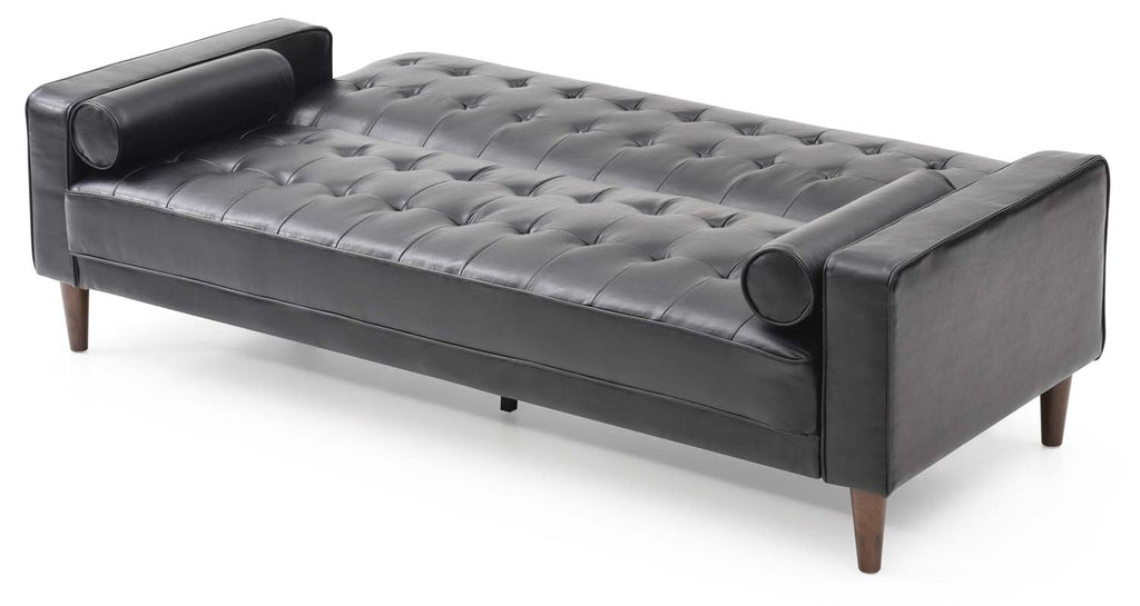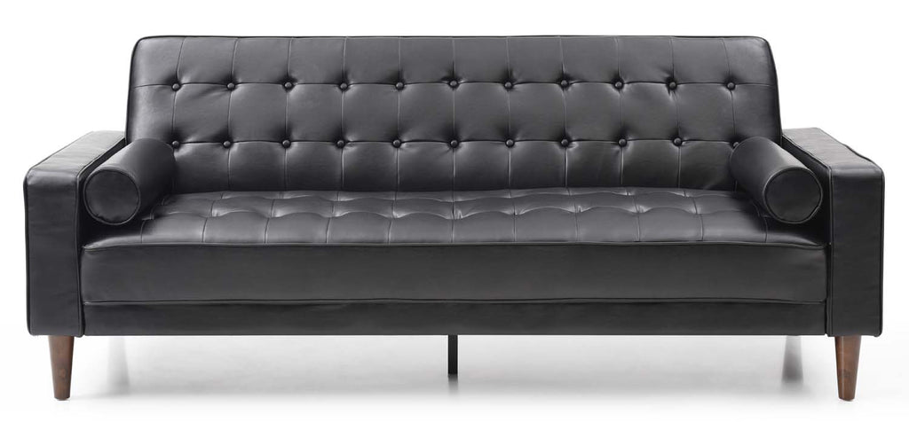 Mid Century Modern Love Seat Can convert into a Sleeper. Wood Legs and Metal Supports on the Back Support The Tufted Seat and Welted Arms. Opens to 75W x43D as a Sleeper . Includes 2 Round Bolster Pillows