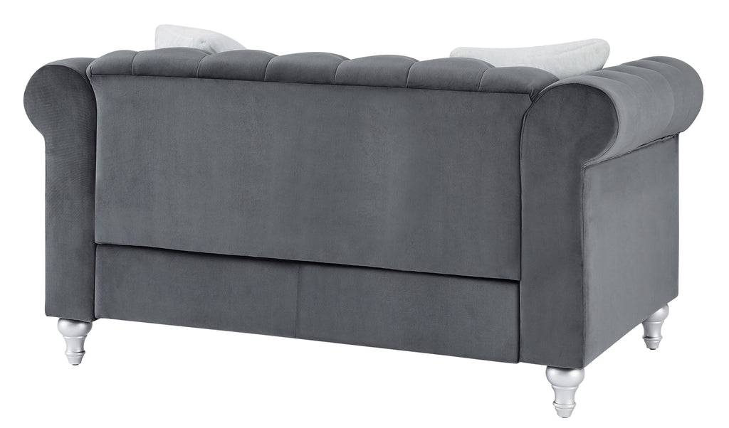 An updated version of the Classic Chesterfield Design. Soft micro suede velvet cover is tufted with faux jewels and set off with chrome nailheads for a stunning look. Pocketed coil seats assure you of long-lasting comfort. Contrasting throw pillow finishes off this group.