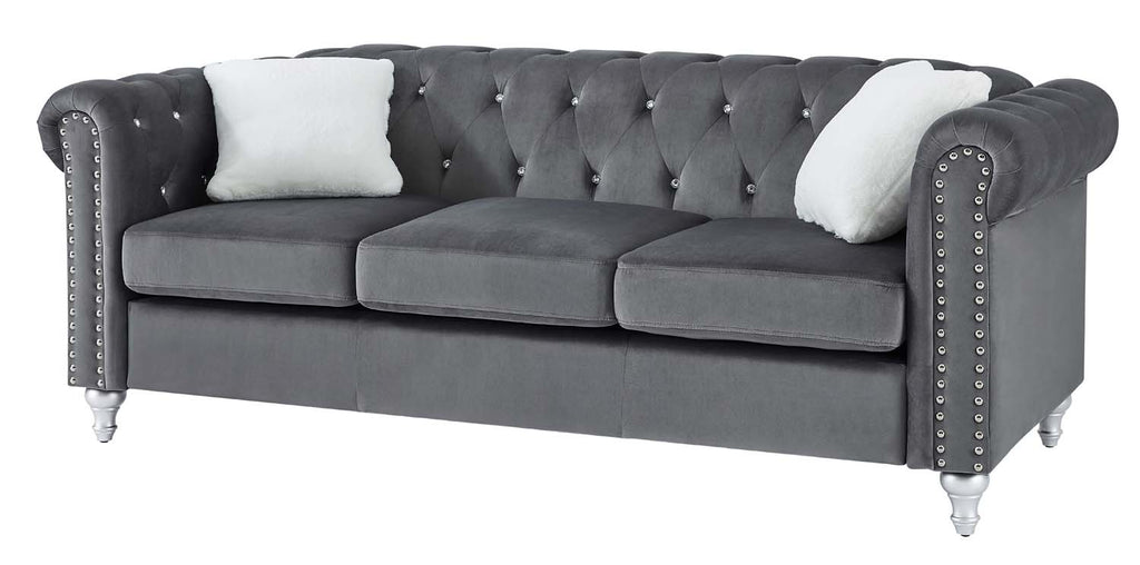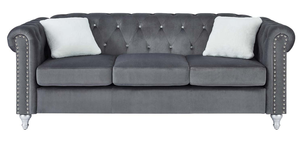 An updated version of the Classic Chesterfield design. Soft micro suede velvet cover is tufted with faux jewels and set off with chrome nailheads for a stunning look. Pocketed coil seats assure you of long-lasting comfort. Contrasting throw pillow finishes off this group.