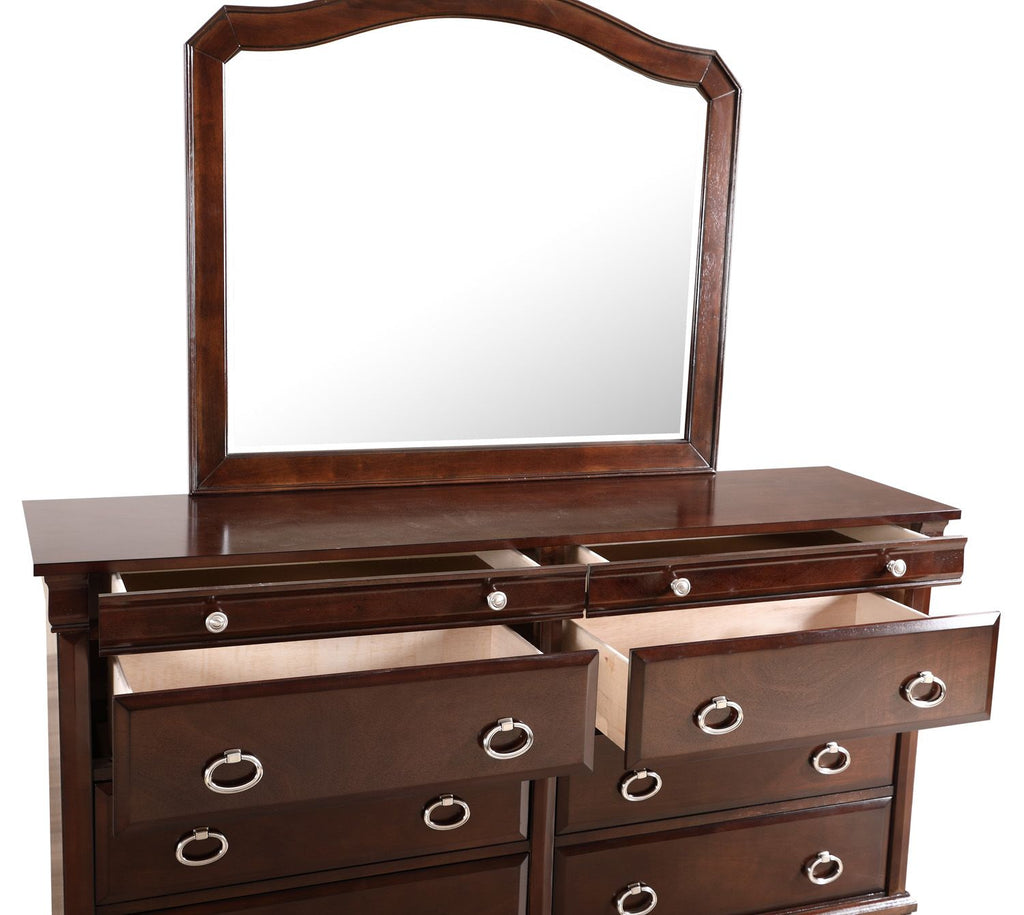Assembled Bedroom Dresser is Finished in Real Wood Veneers over Manufactured and Solid Wood. Drawers Move on Center Supported Metal Guides and Are Dovetailed Front and Back. Corner Blocks are utilized to Support Drawer Bottoms. Choose from a Variety of Colors. Additonal Case Pieces are Available as well as Matching Beds